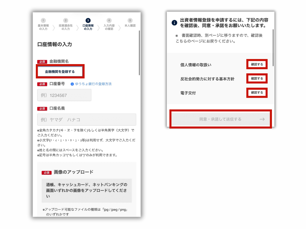 口座情報を入力し、口座情報を確認できる書類をアップロードします。