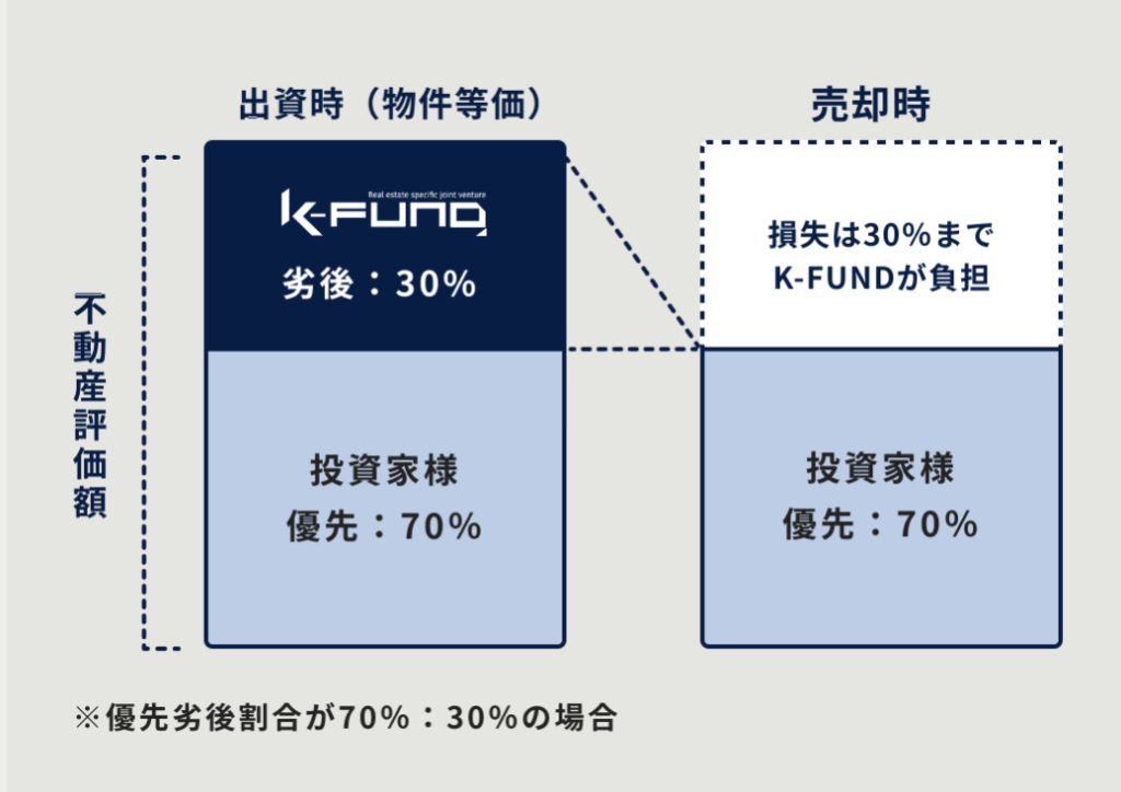 K-FUNDでは、投資家の損するリスクを限りなくゼロにするために、全ファンドで「優先劣後(ゆうせんれつご)システム」を採用しています。