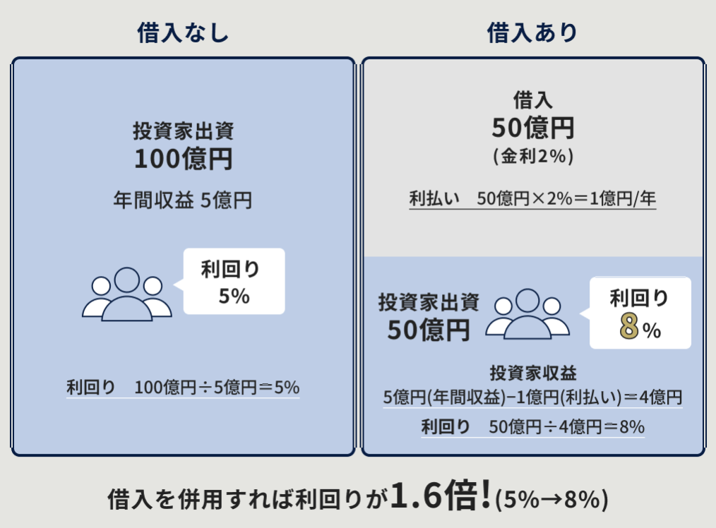 借入を活用する分、プロジェクト全体としてはローン利息等のコストも発生するけど、そのコスト以上に利益性の高い案件を厳選しているよ!