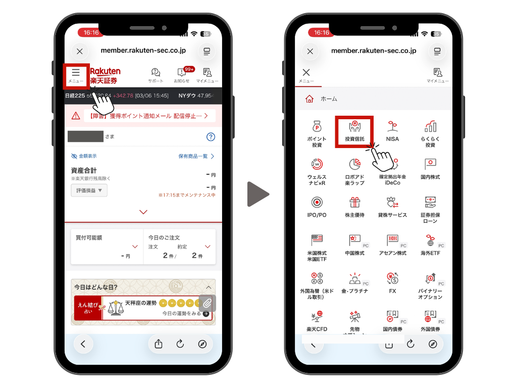 ログイン後、【左上メニュー】☞【投資信託】をタップ