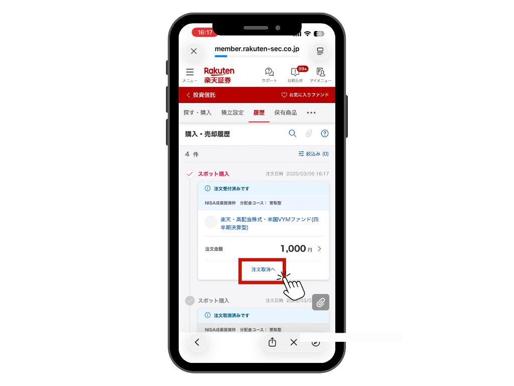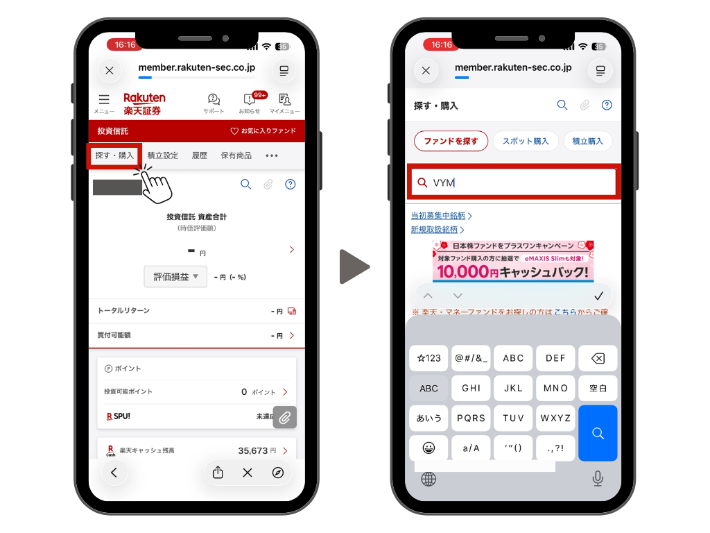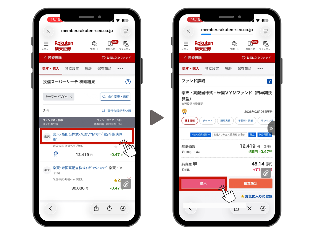 検索結果から、購入したい銘柄をタップし【購入】をタップ