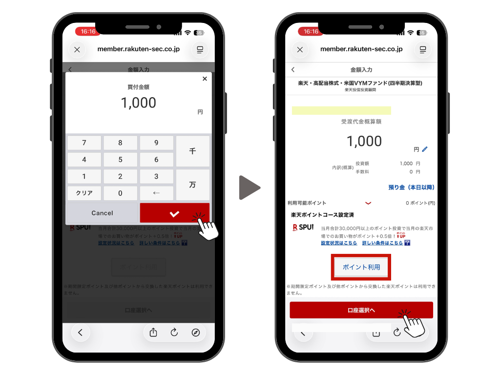 楽天ポイントを使う場合はここで【ポイント利用】をタップし、ポイント数を入力します。