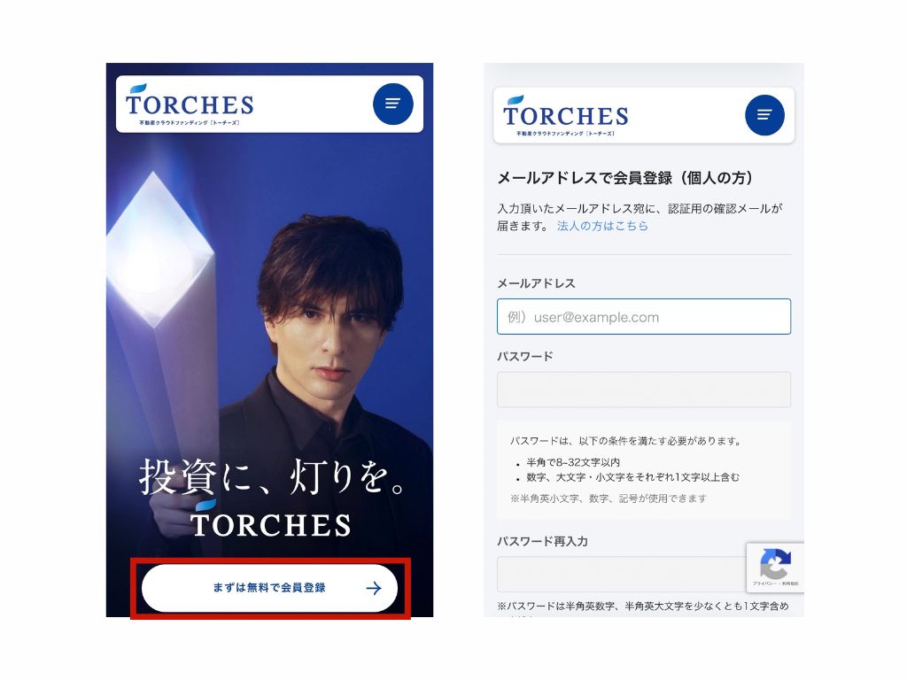 「無料で会員登録」というボタンを選んで、仮登録のページへ進んでメールアドレスとパスワードを入力して