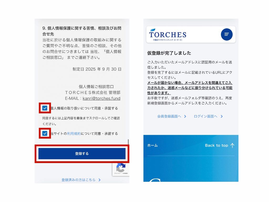 利用規約等のチェックを入れたら「登録する」をタップ。