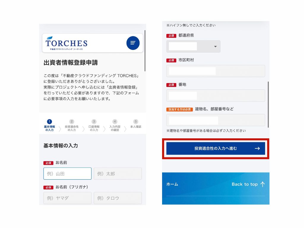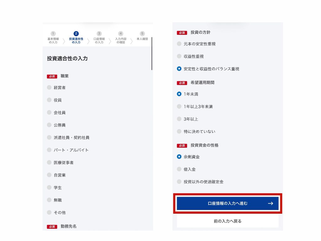 お名前から順に入力していき、入力が終わったら「投資適合性の入力へ進む」をタップ。