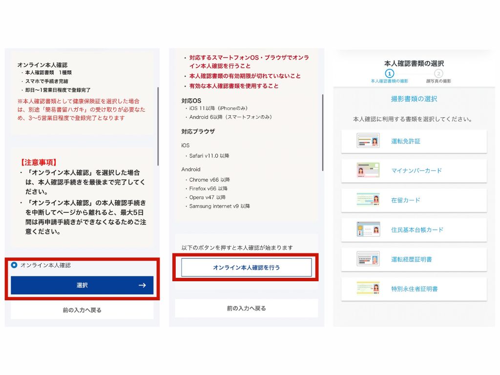 本人確認方法を「オンライン本人確認」を選んだら、「選択」をタップ。